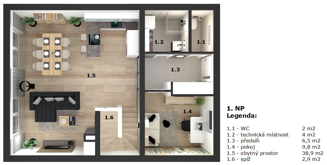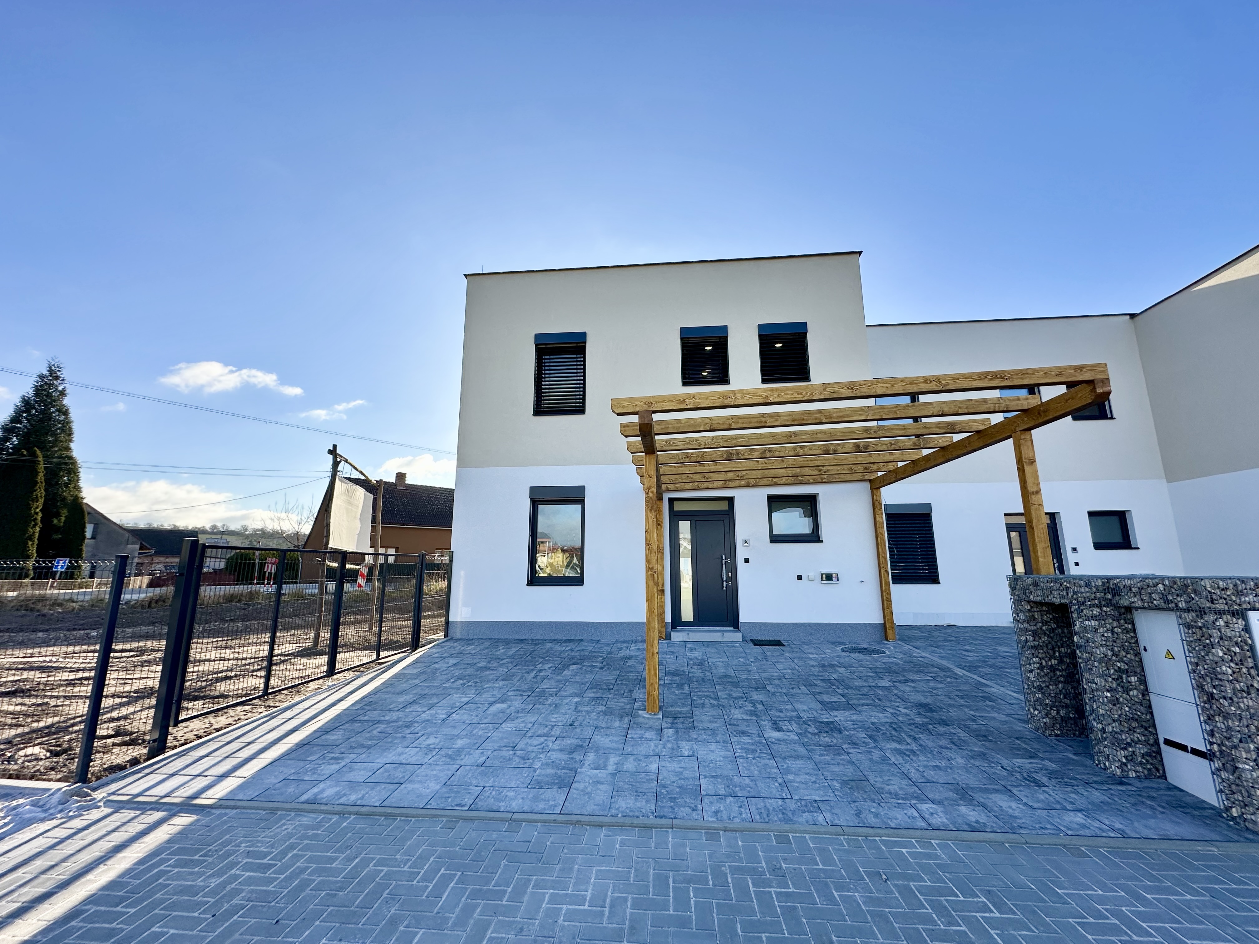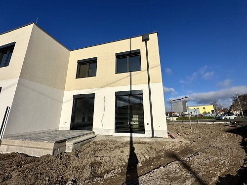 Naše domy jsou zděné z pórobetonu a nabízí dispozici 5+kk s terasou, zahradou a parkovacím stáním. Celková užitná plocha domu je 130 m2, terasy 9 nebo 12 m2 a výměra pozemků se pohybuje od 264 do 384 m2 (zastavěnost 35 – 59%). Orientace zahrady a terasy je na jih, vstup do domu je na severní straně.