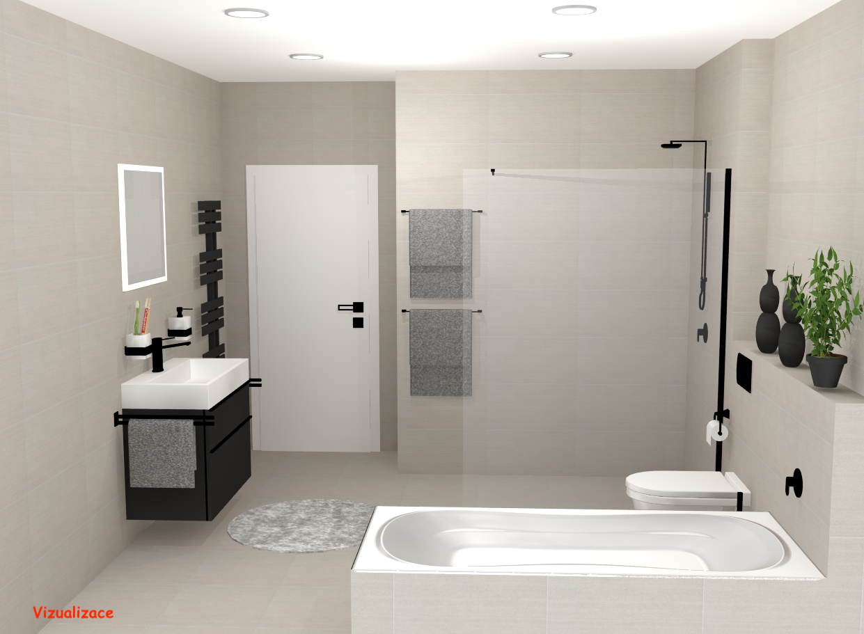 Sanitární zařízení (WC, umyvadla, vany/sprchové kouty) odpovídá standardu pro rodinné bydlení; přesná specifikace (značky, řady) např. Geberit, Hansgrohe, Jika. Sprchové kouty jsou standardně řešeny žlabem.