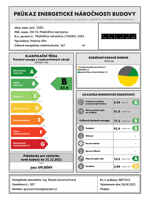 Domy jsou situované v okrajové části obce a jsou napojeny na elektřinu, obecní tlakovou kanalizaci a vodu získávanou z vlastní studny. Vrtaná, 30 m hluboká studna byla zkolaudována a byla provedena zkouška vydatnosti pro 6 rodinných domů. Plyn v domech není. Pro vytápění a ohřev vody jsou instalována tepelná čerpadla vzduch – voda a teplovodní podlahové vytápění. Na podlahách je dlažba nebo vinyl. Okna jsou plastová s izolačním trojsklem. Ve všech oknech jsou exteriérové předokenní žaluzie elektrické. Zabezpečovací systém Jablotron a domovní videotelefon. Tento nízkoenergetický dům se řadí do třídy B, což vám poskytne úsporu energií a nízké náklady na provoz. V domě je příprava na napojení fotovoltaické elektrárny, rekuperaci, klimatizaci a komín (vystrojení, vložka a kamna nejsou součástí dodávky). Na domě je osazená příprava pro nabíjení elektromobilu.