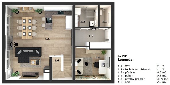 Příprava teplé vody je řešena prostřednictvím tepelného čerpadla a zásobníku. Umístění zásobníku/technologie je v technické místnosti domu v 1.NP.
