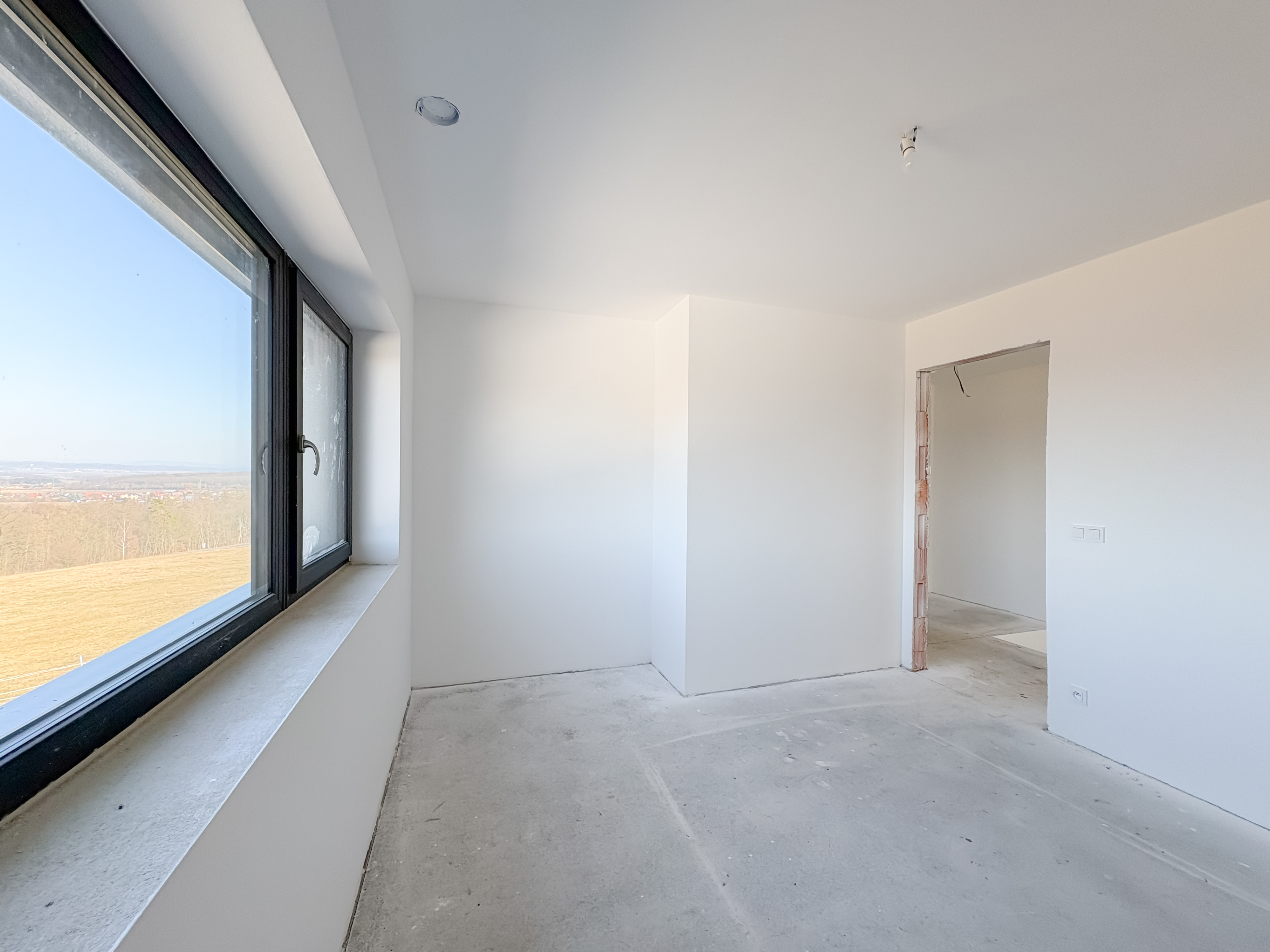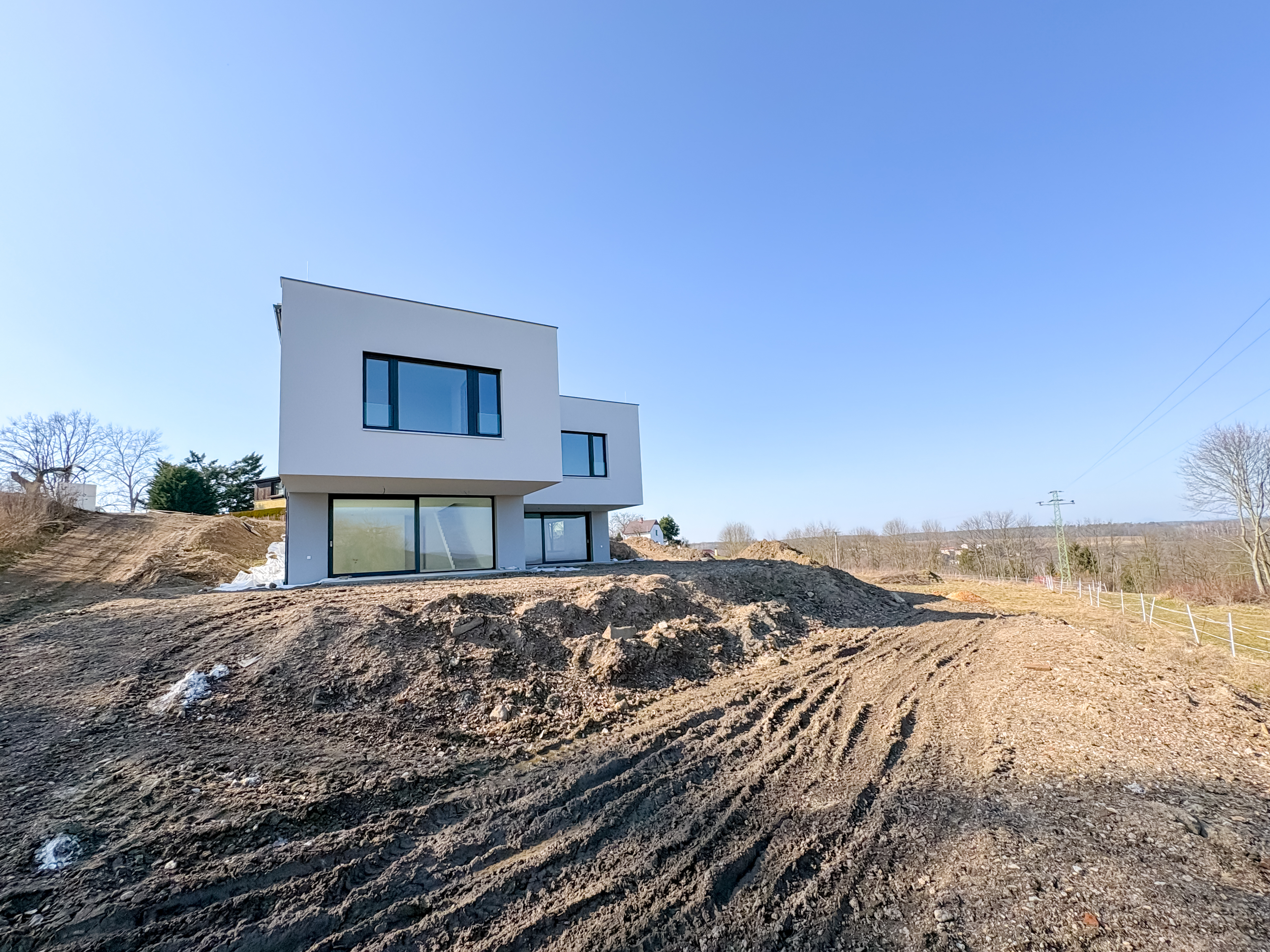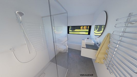 Komfort doplňují exteriérové elektrické žaluzie, řízené větrání s rekuperací Jablotron, dlažby nebo vinylové podlahy, v garáži epoxidová stěrka.