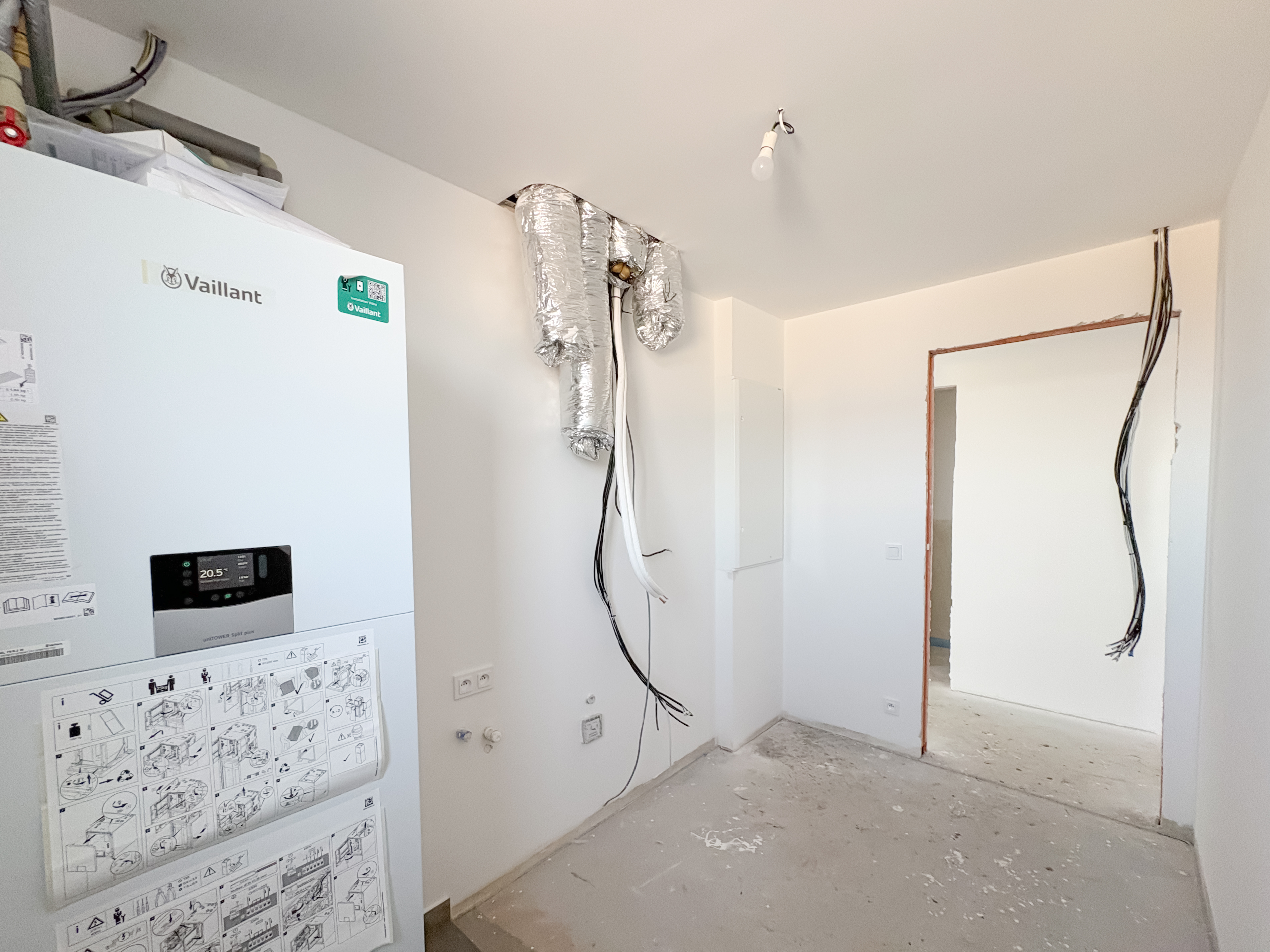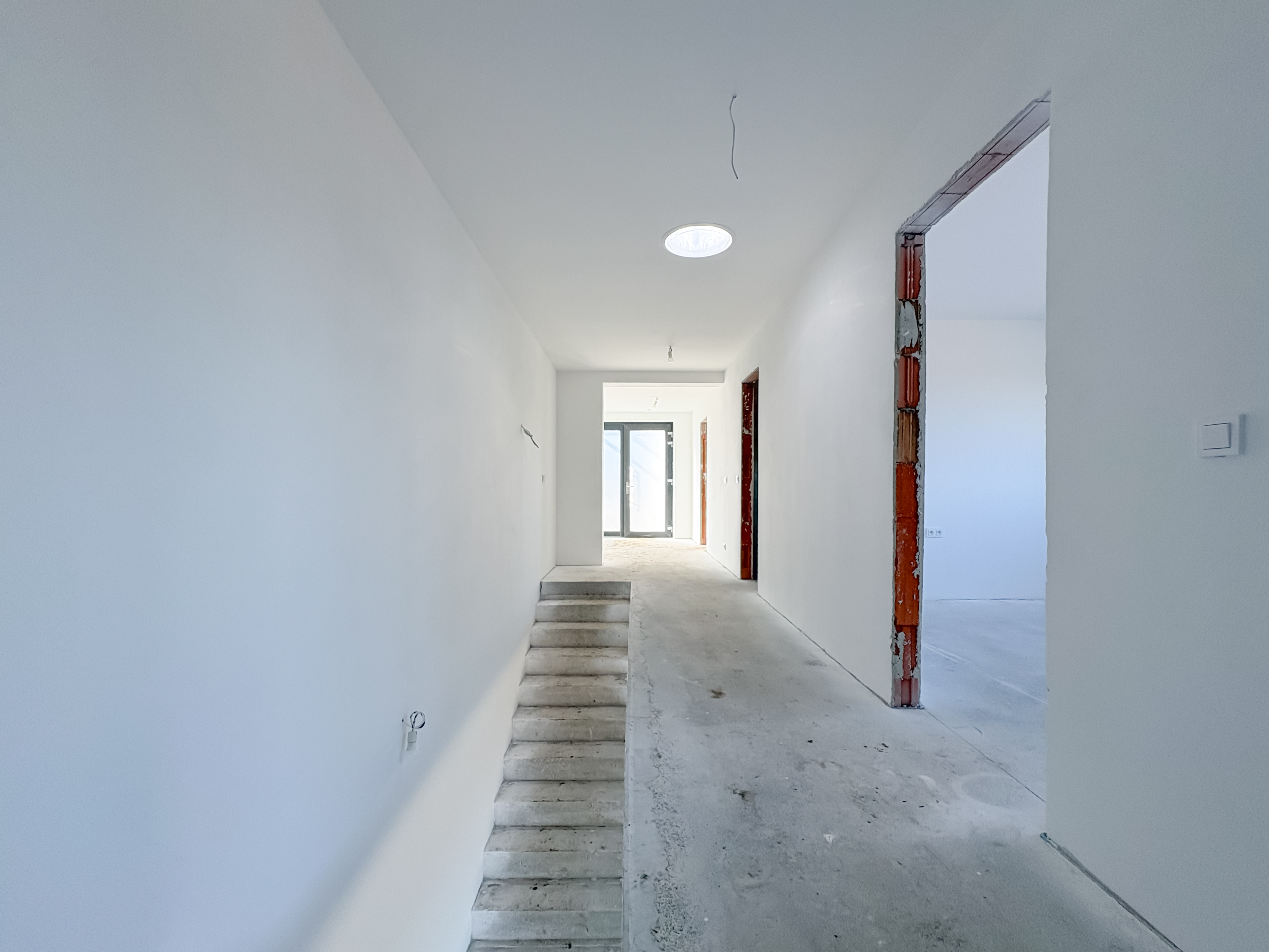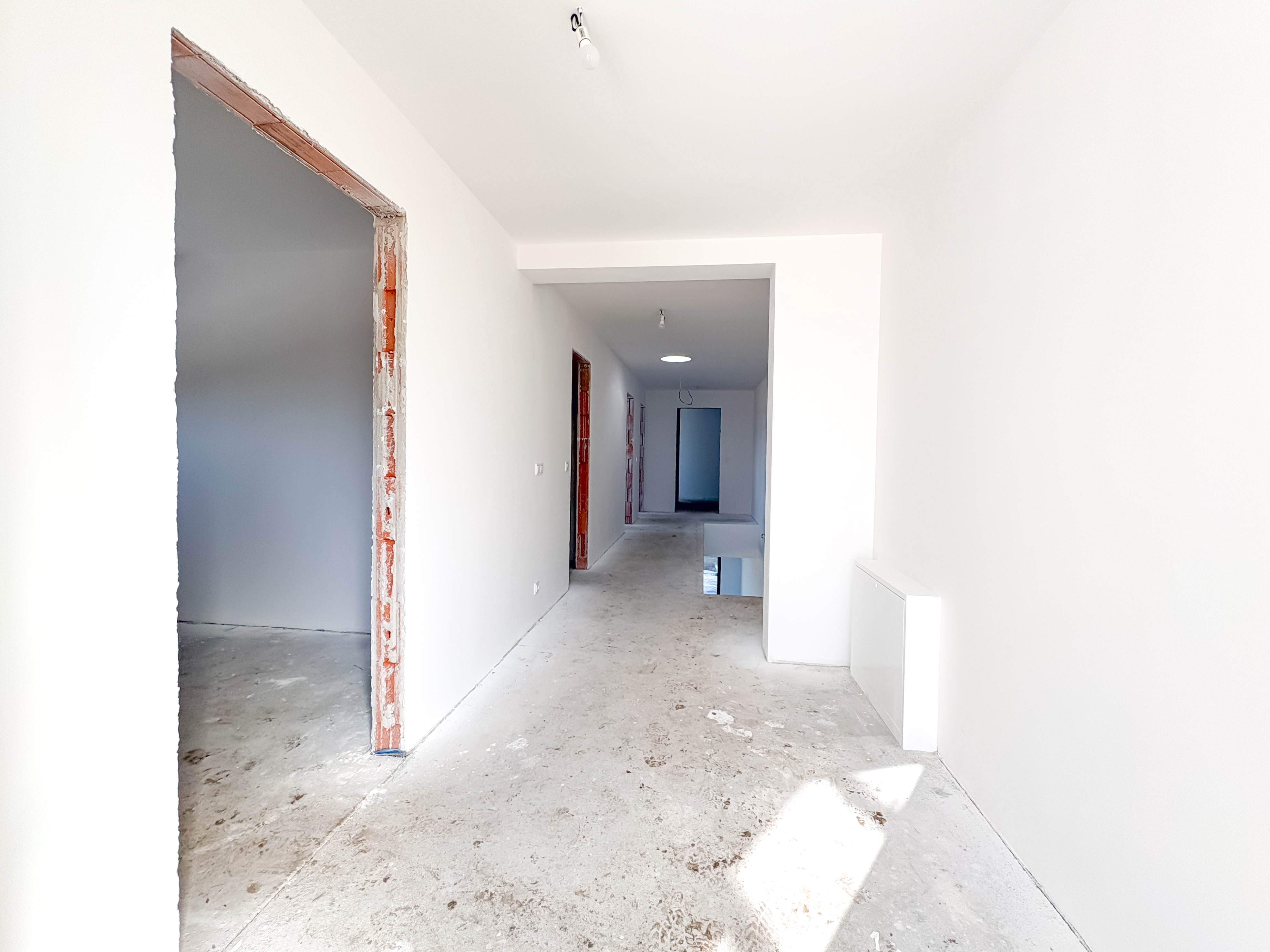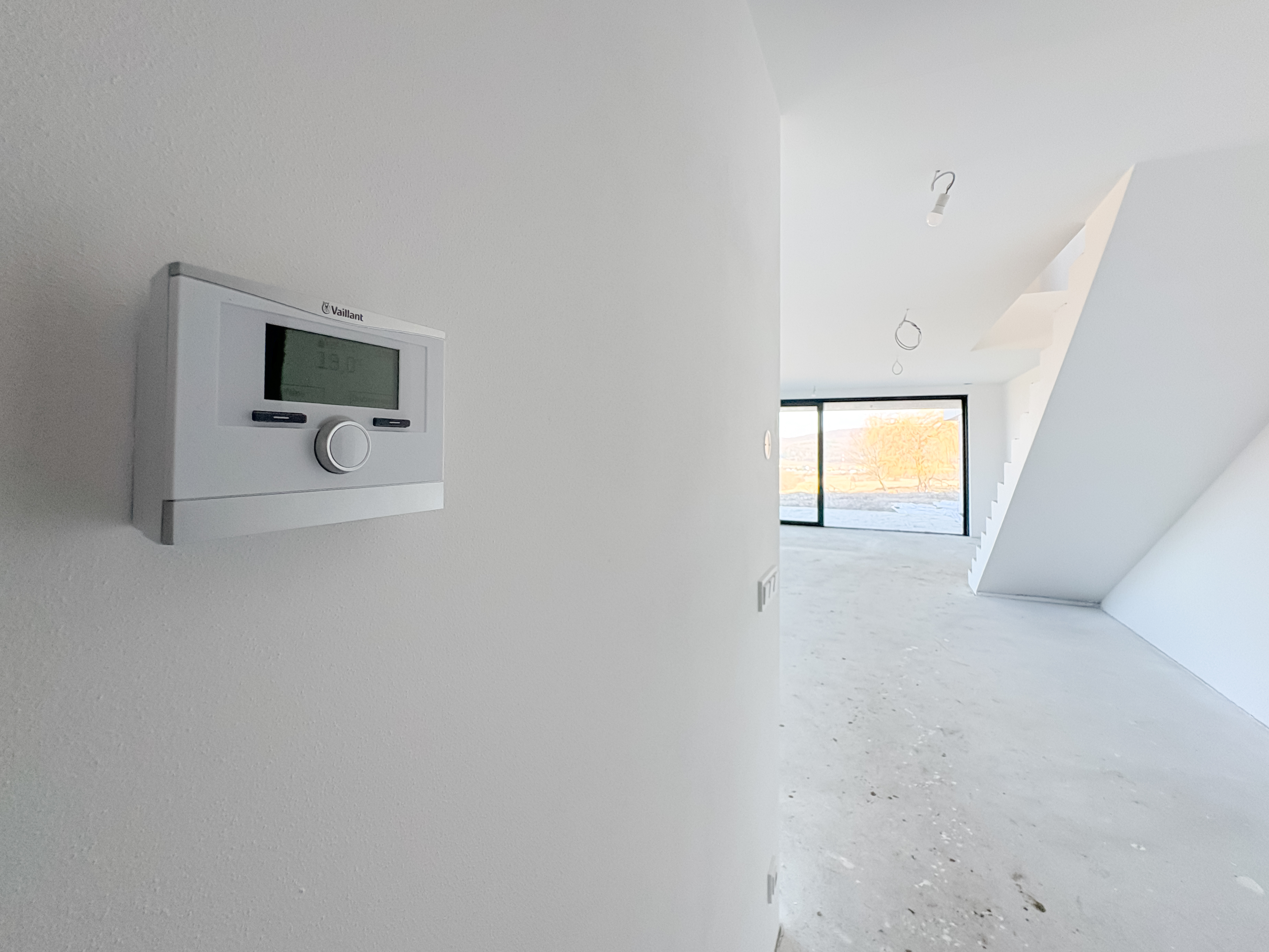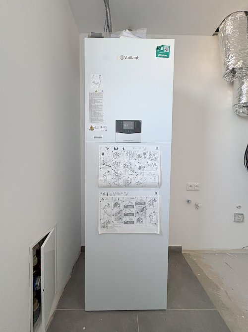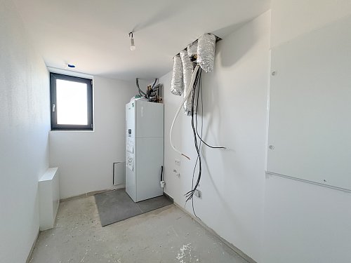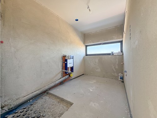 The house is built using brick construction, features superior insulation, and falls into Energy Performance Class B – a low-energy home. Heating is provided by an air-to-water heat pump with hydronic underfloor heating. The property includes an integrated hot water tank (180 l), PVC six-chamber windows with triple glazing, and an aluminum sliding door from the living room to the terrace. The houses are structurally separated by expansion joints and divided by independent walls made of acoustic clay blocks, with a 50 mm thick expansion gap filled with mineral wool.
