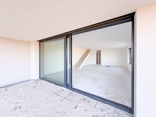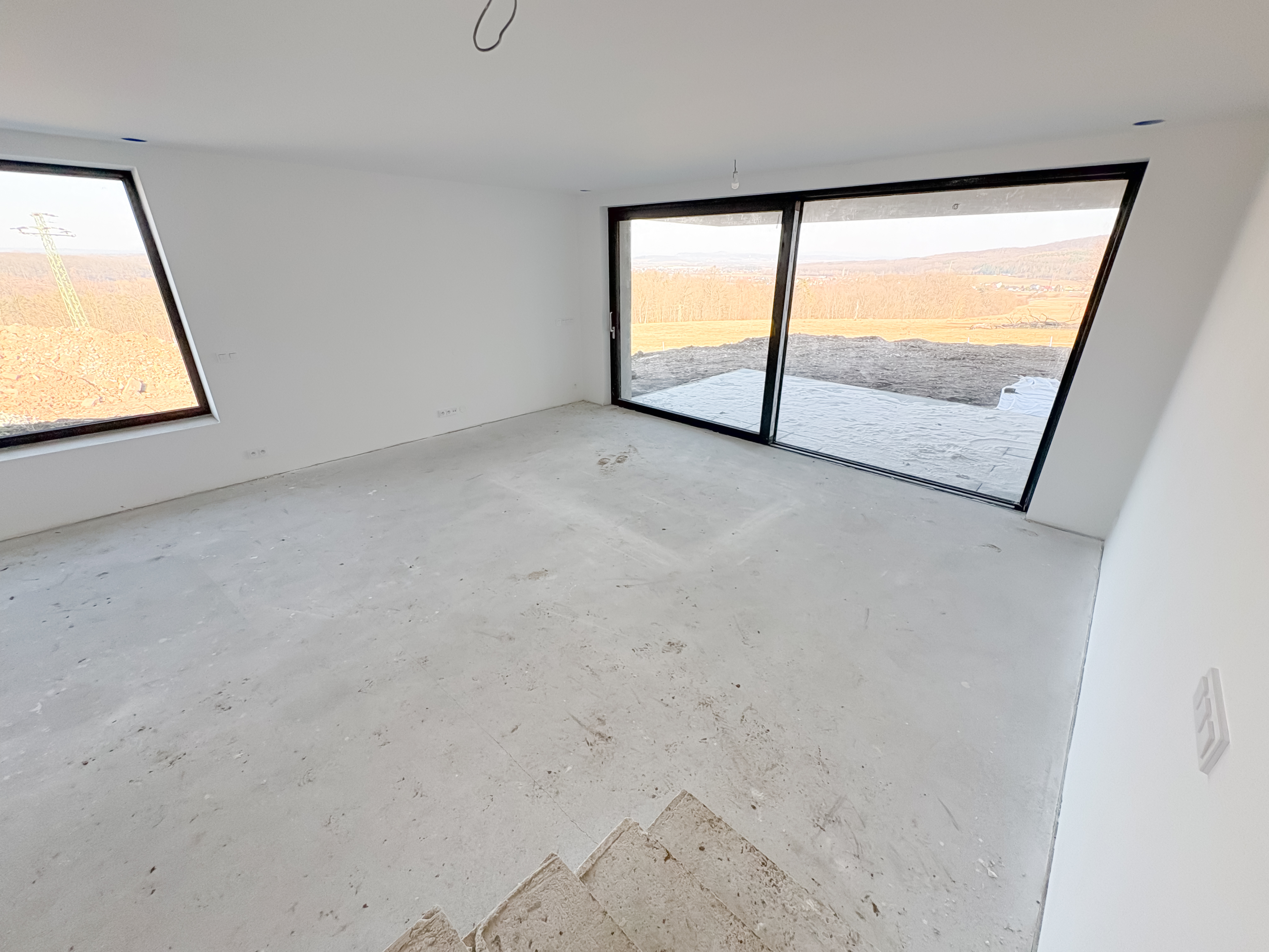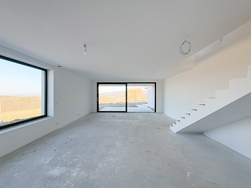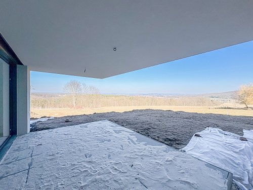 Z obývacího pokoje je přímý vstup na terasu orientovanou na východ, odkud se otevírá krásný výhled do přírody a okolní krajiny.