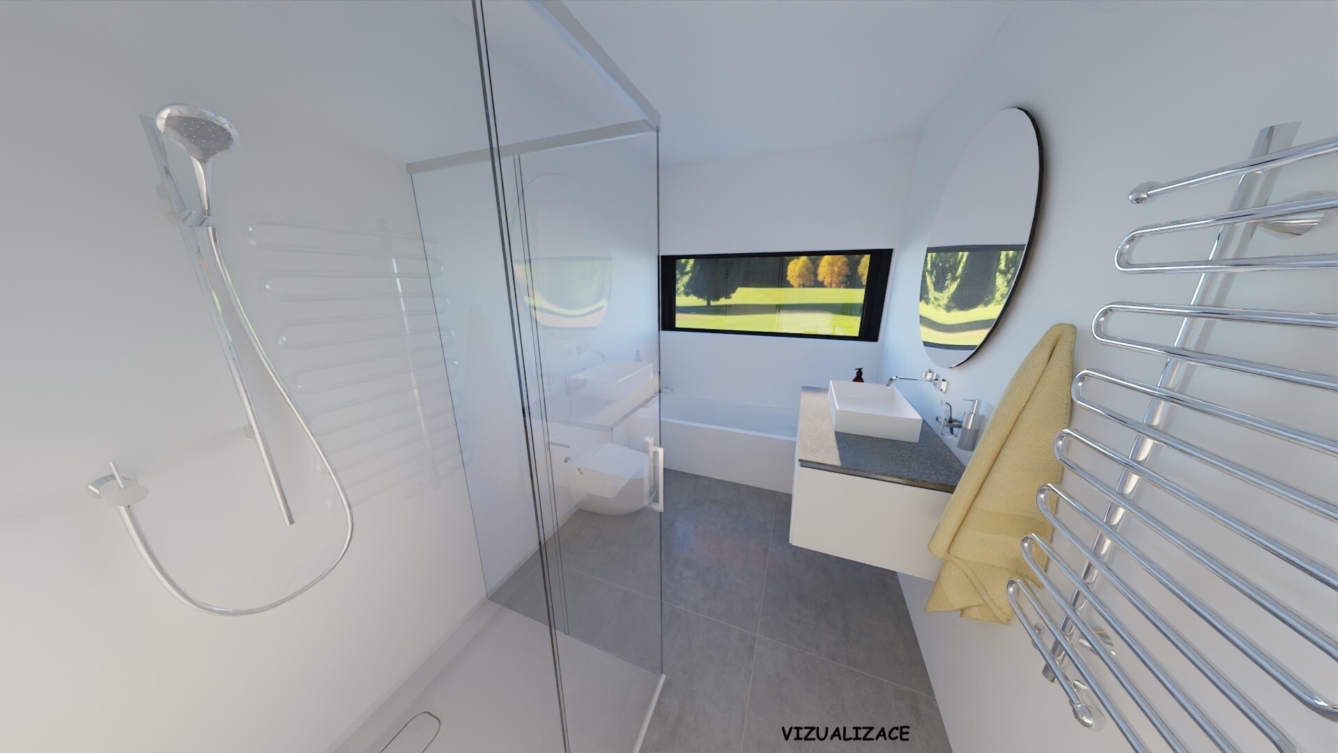 Koupelny jsou dvě – obě se sprchovým koutem a WC, jedna navíc s vanou. V přízemí je ještě samostatné WC.