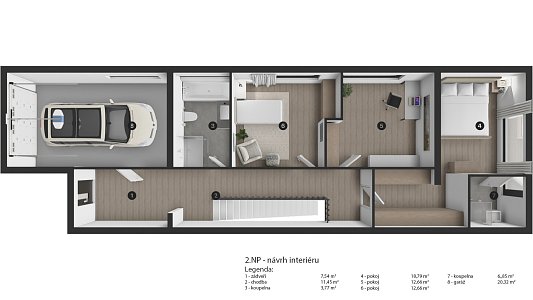 Atypicky řešená dispozice 5+kk s garáží nabízí celkovou podlahovou plochu 176 m².