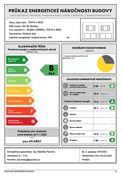 Dům je zděný, nadstandardně zateplený a spadá do energetické třídy B – nízkoenergetický dům. Vytápění zajišťuje tepelné čerpadlo vzduch–voda s teplovodním podlahovým vytápěním. Součástí je integrovaný zásobník TUV (180 l), plastová šestikomorová okna s trojskly a bezprahové hliníkové posuvné okno z obývacího pokoje na terasu.