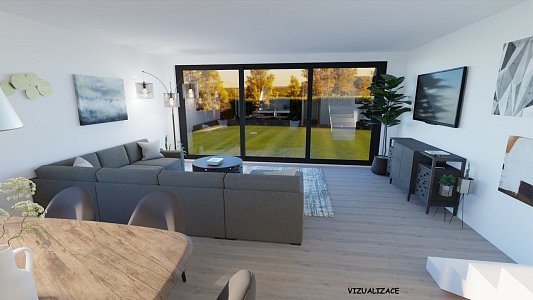 Z obývacího pokoje je přímý vstup na terasu, odkud se otevírá krásný výhled do přírody a okolní krajiny.